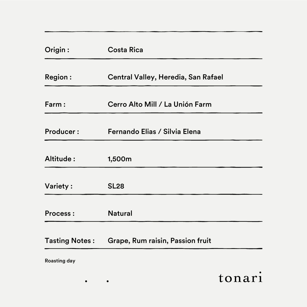 生産地: Central Valley, Heredia, San Rafael(セントラル・バレー、エレディア、サン・ラファエル)